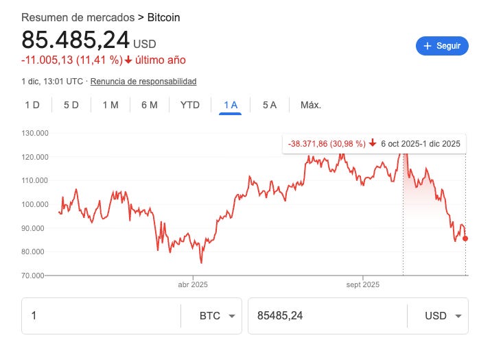 Desde máximos, Bitcoin ha caído más de un -30 %.