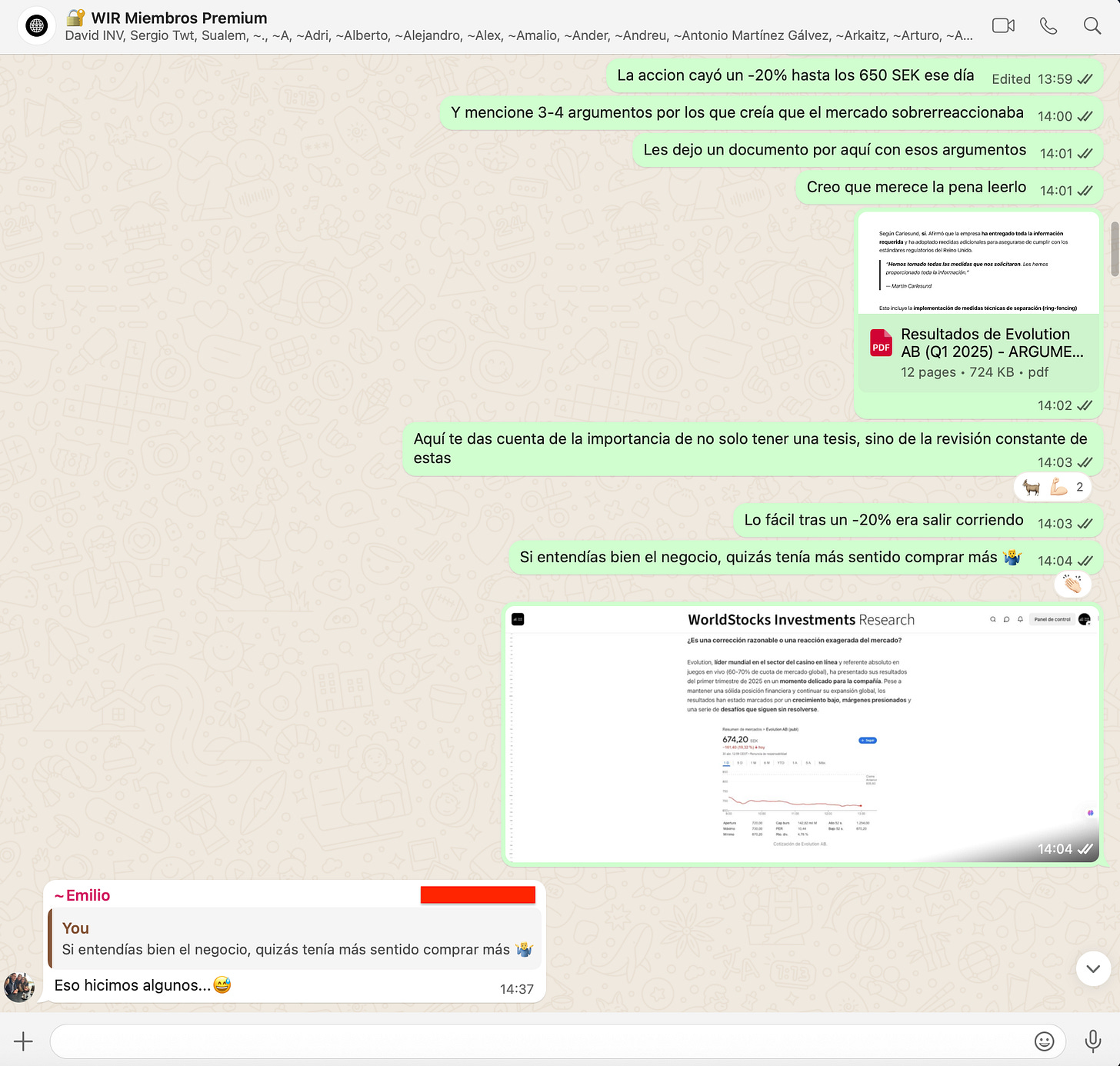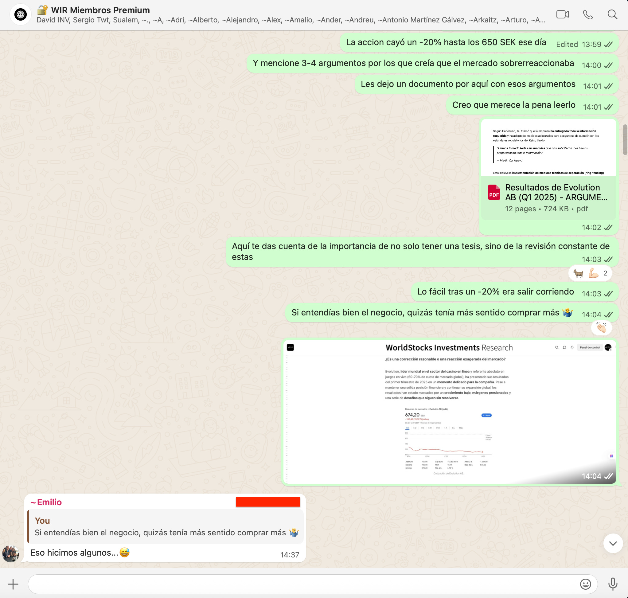 Tan convencido estaba, que personalmente incrementé mi posición en Evolution y lo compartí con nuestra comunidad privada. Muchos miembros Premium de WIR también aprovecharon esa oportunidad. Y lo que parecía un callejón sin salida terminó siendo una lección de por qué seguir de cerca tus inversiones marca la diferencia.
