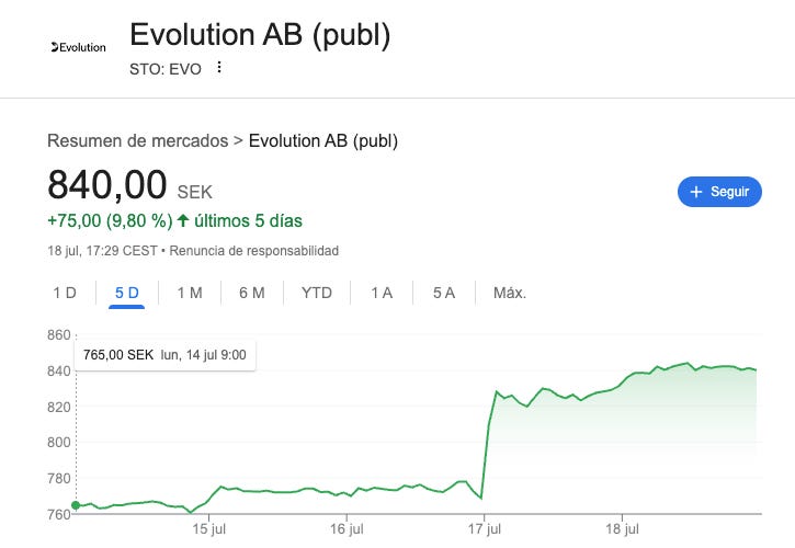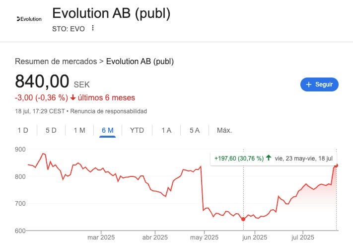 Ayer, Evolution presentó sus resultados del Q2. Esta vez, el mercado reaccionó con una subida del +8 %, llevando la acción a cotizar a 840 SEK: un +30% desde los mínimos marcados tras el Q1 (y mi artículo).