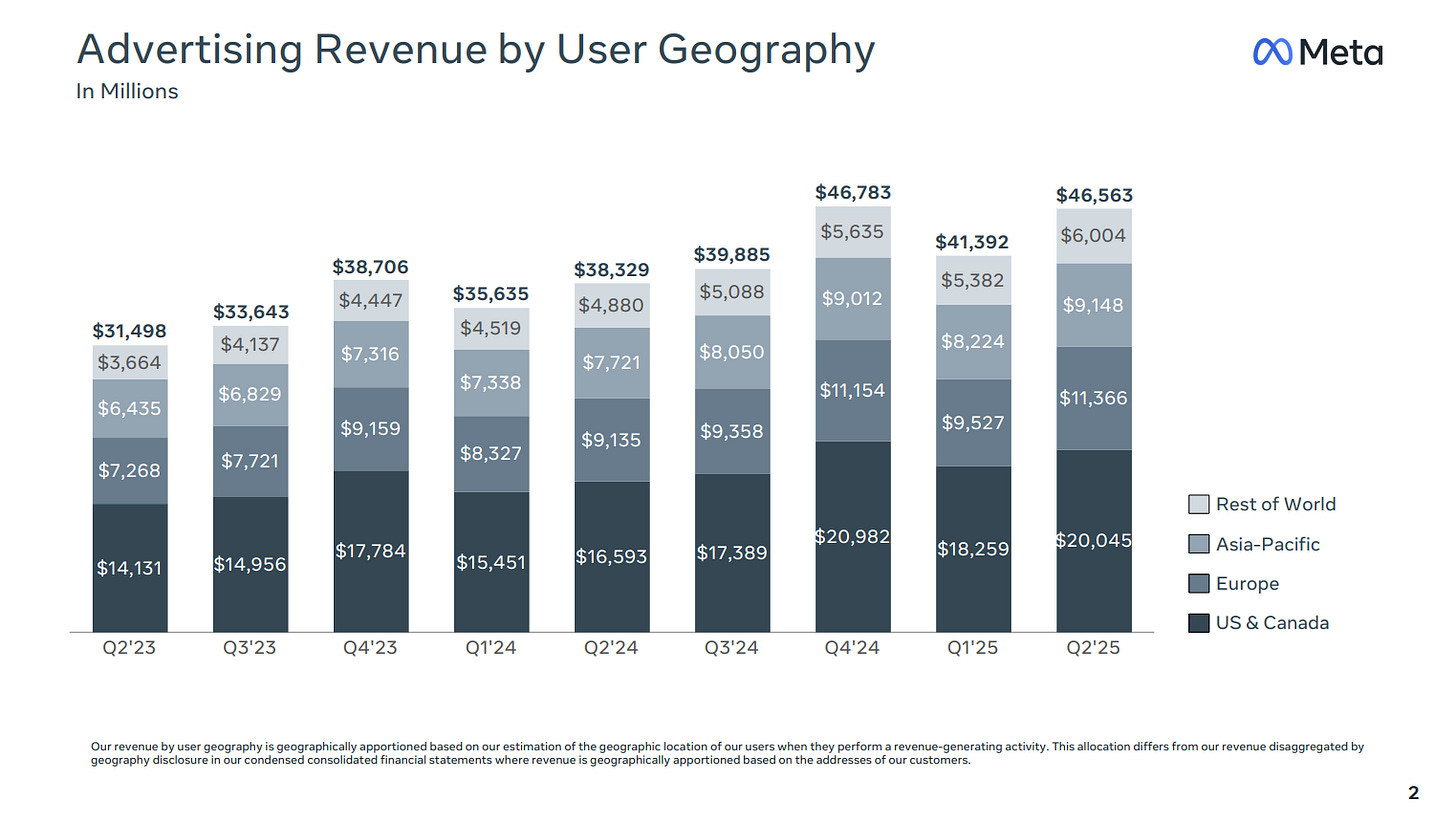 Meta Platforms cerró el Q2 de 2025 con 47.550 millones de dólares en ingresos, lo que representa un +22 % interanual. La publicidad sigue siendo el motor dominante del grupo, con 46.560 millones de dólares, un incremento del +21 %, impulsado por un crecimiento del +11 % en impresiones y un aumento del +9 % en el precio medio por anuncio (CPM).