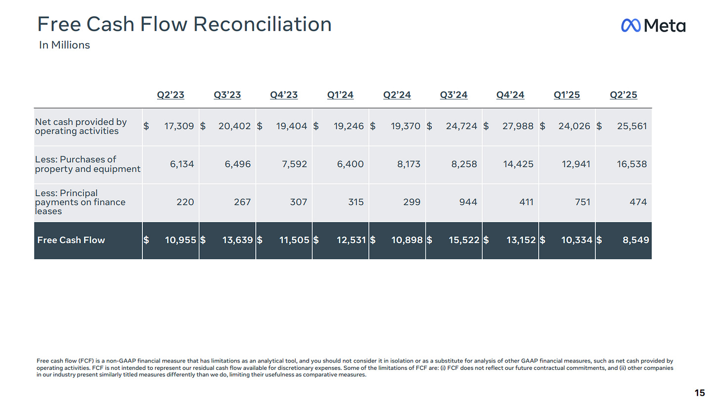 El Free Cash Flow fue de 8.549 millones, una caída del -22 % respecto a los 10.898 millones del Q2 2024. Pero esta caída no refleja un deterioro operativo, sino el resultado directo de un salto en la inversión en infraestructura: Meta gastó 16.538 millones en CapEx, el doble que hace un año (8.173 millones), además de otros 474 millones en pagos de leasing financiero.