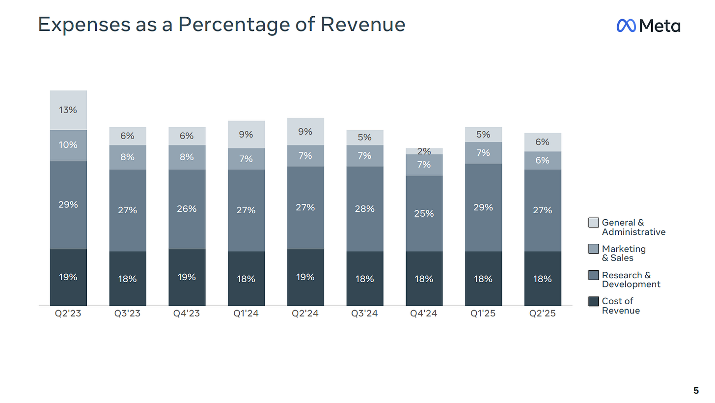 Meta cerró el segundo trimestre de 2025 con unos ingresos de 47.516 millones de dólares y un total de costes y gastos de 27.075 millones, lo que representa un crecimiento del +12 % interanual. En comparación, los ingresos crecieron un +22 %, lo que permitió una expansión significativa del margen operativo, que sube del 38 % al 43 %.