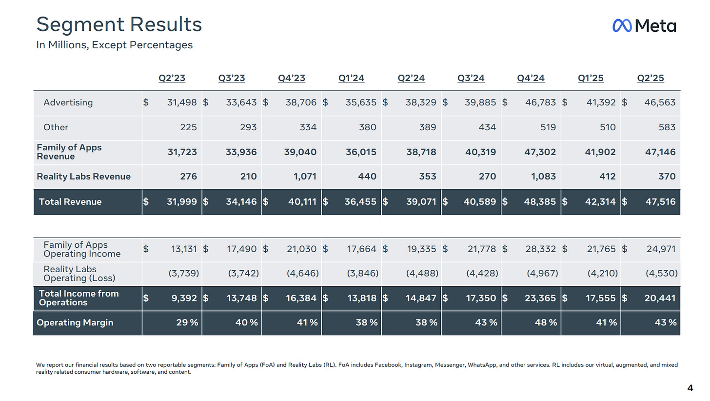 Meta ha presentado unos resultados del segundo trimestre que superan las expectativas del mercado y confirman el buen momento de su negocio principal: Family of Apps. Facebook, Instagram y WhatsApp siguen generando ingresos a un ritmo fuerte, con márgenes altos y sin señales de fatiga.