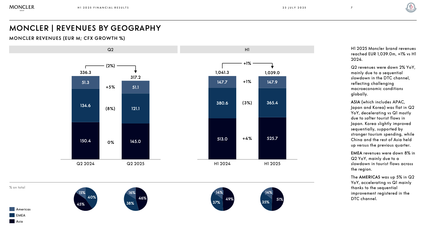 Durante el segundo trimestre de 2025, Moncler registró una caída del -2 % en ingresos (a tipo de cambio constante), reflejando debilidad en sus dos regiones clave: Europa y Asia. En el conjunto del semestre, la marca crece un +1 %, pero el crecimiento es muy heterogéneo por regiones.