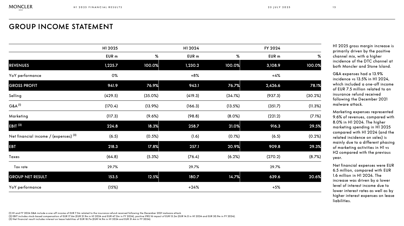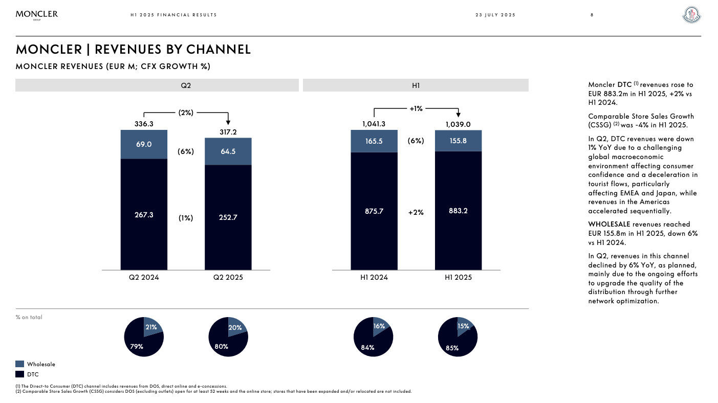 Los ingresos del H1 2025 cayeron un -1% interanual, aunque en el Q2 crecieron un +6%, gracias al repunte en ambos canales: D2C y wholesale.