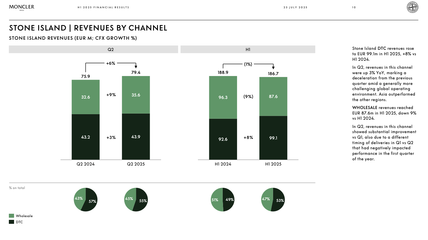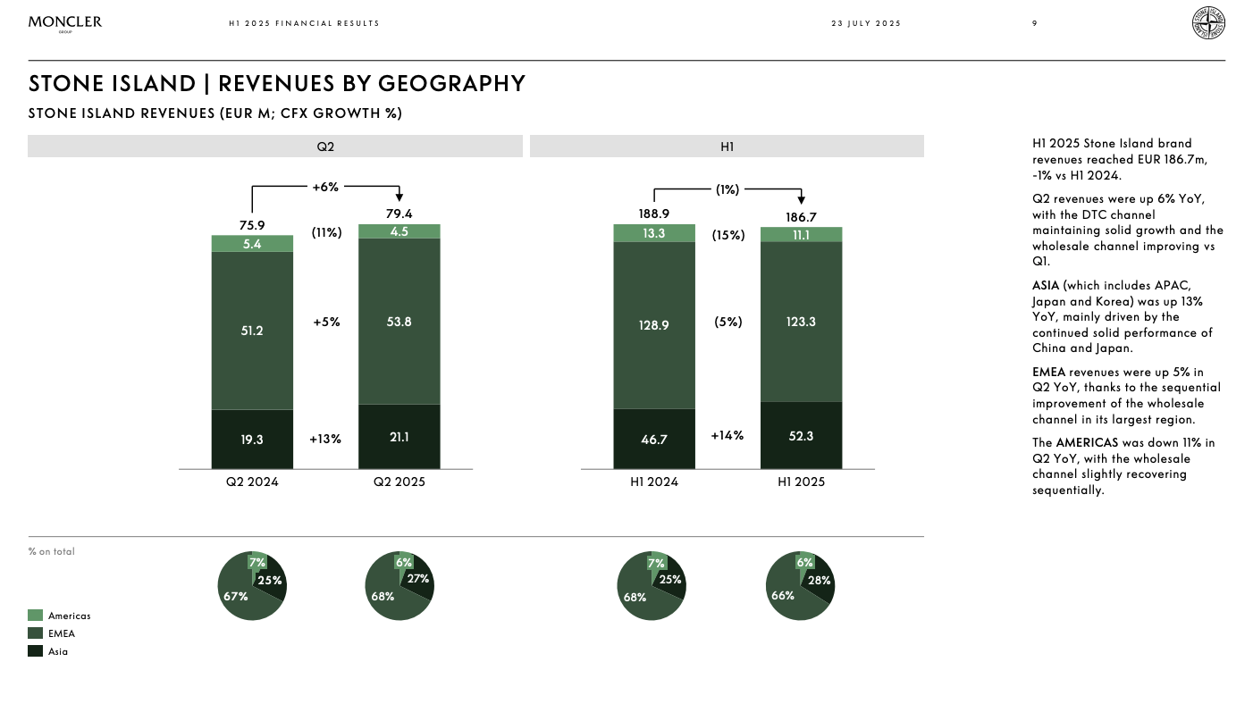 “En Stone Island, Asia ha sido el motor, y además hemos mejorado en wholesale frente al primer trimestre, donde los retrasos logísticos penalizaron las entregas. Seguimos viendo buena tracción del cliente local, incluso con menor tráfico general.”