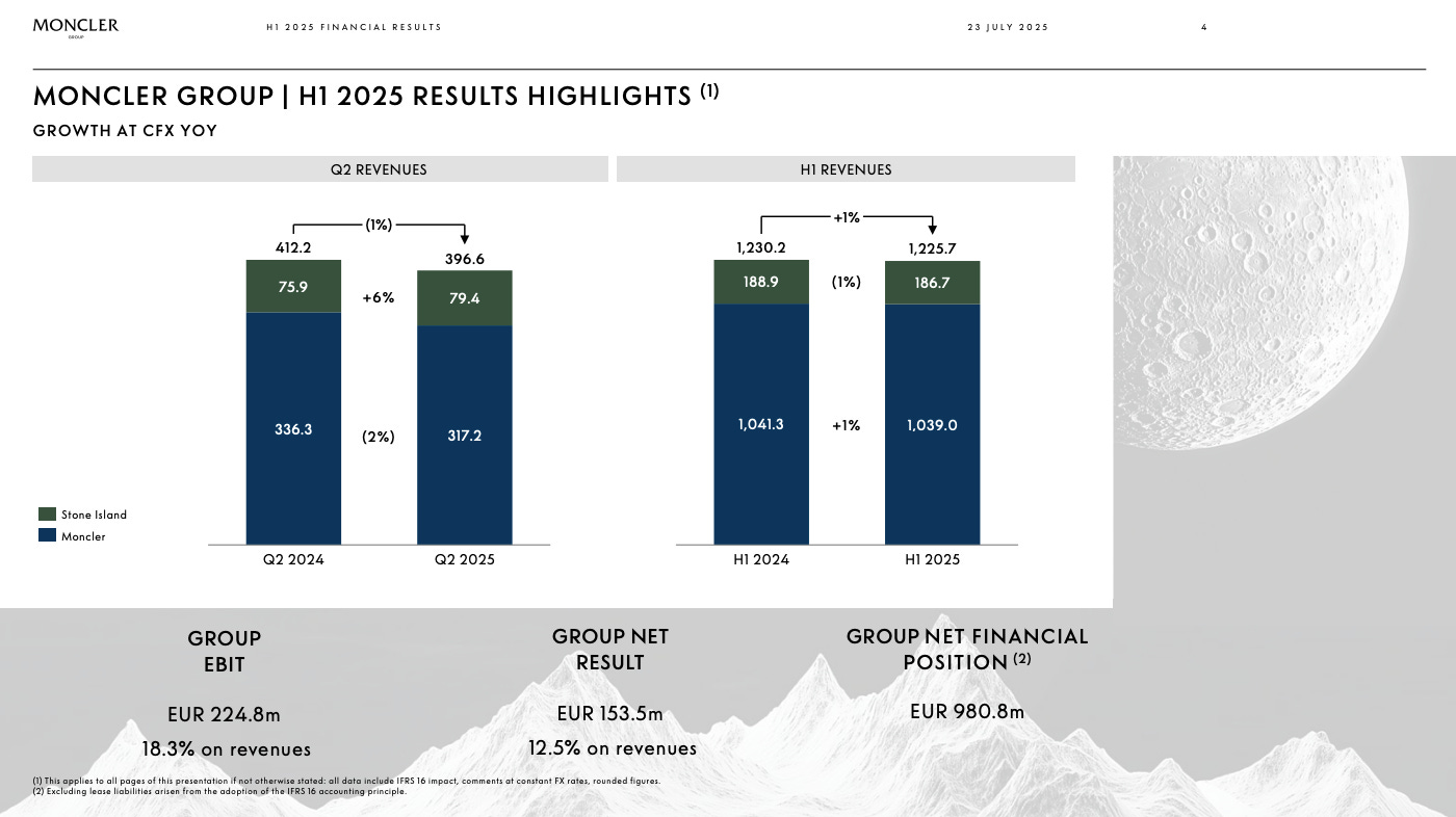 El Grupo Moncler cerró el primer semestre de 2025 con unos ingresos consolidados de 1.225,7 millones de euros, lo que representa un crecimiento del +1 % interanual a tipo de cambio constante. El segundo trimestre, en cambio, registró una ligera caída del -1 %, reflejo de un entorno más frágil a nivel macroeconómico, especialmente en lo que respecta al consumo turístico en Europa y Asia.
