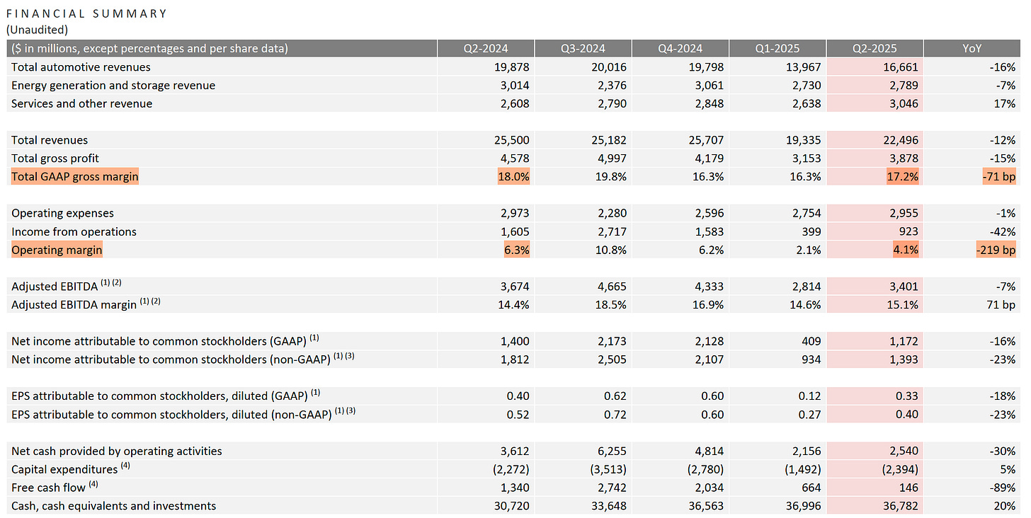 El margen bruto se ha mantenido relativamente estable dentro del rango habitual de Tesla en los últimos trimestres, aunque sí cae ligeramente en comparación con el segundo trimestre del año pasado.