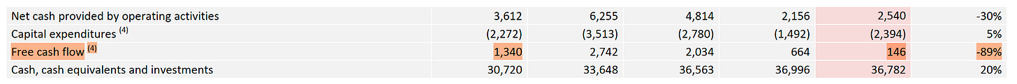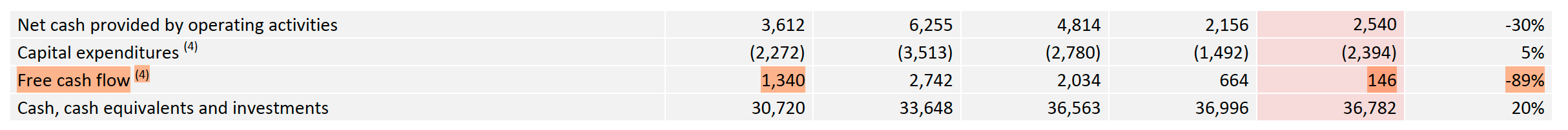 Según las propias cifras de la compañía, el free cash flow en el segundo trimestre ha caído un 89% respecto al mismo periodo del año anterior: de 1.340 millones de dólares en el Q2 de 2024 a solo 146 millones en este Q2 de 2025.