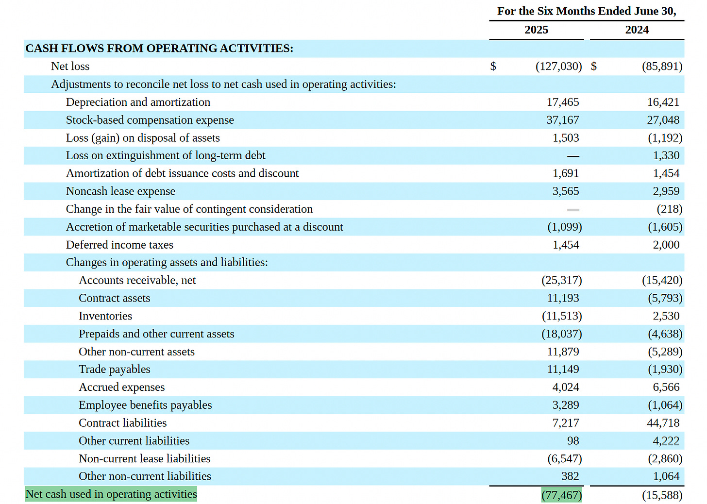 En el estado de flujos de caja, la foto es coherente con el punto del ciclo vital en el que se encuentra Rocket Lab. El flujo operativo es negativo —y no podía ser de otra manera— porque partimos de un resultado neto ya en números rojos.