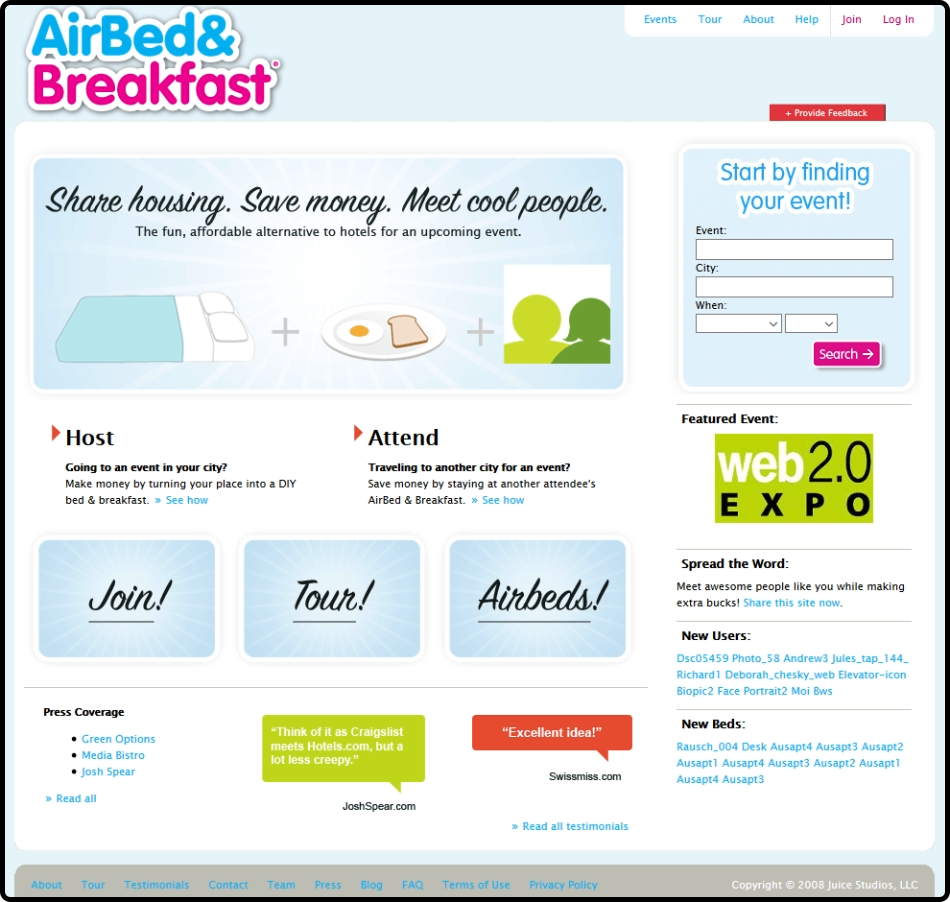 Lanzaron la primera versión del sitio web en 2008, coincidiendo con la Convención Nacional Demócrata en Denver. Otra vez, el contexto jugó a su favor: los hoteles estaban saturados y cientos de personas publicaron anuncios ofreciendo espacio en sus casas.